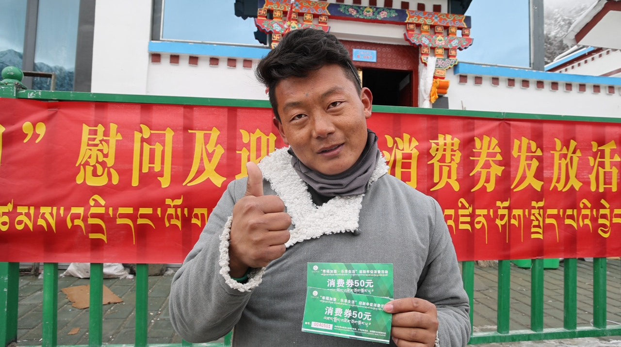 慰问组代表加查县委、人大、政府、政协,向大家敬献哈达,送上12.8万元慰问金、价值3.84万元的慰问品和价值5.01万元新年消费券,并致以节日的祝福。