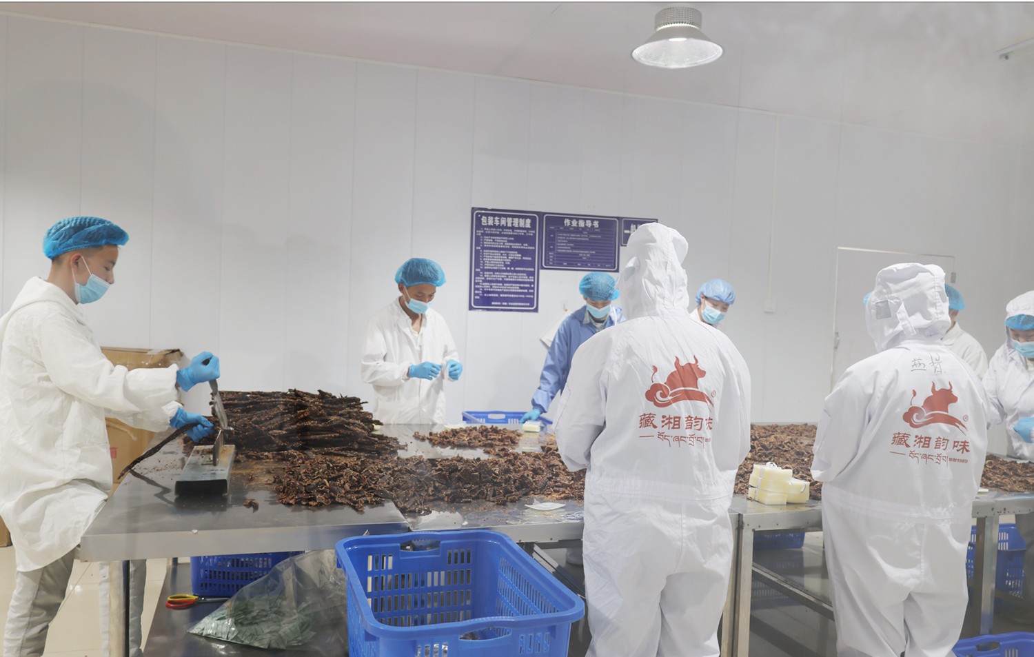 2023年,在长沙援藏工作队的招商推动下,企业落地按下“快进键”,如今已为当地农牧民提供近200个就业岗位,人均年增收达6万元。2024年,藏湘韵味又与贡嘎县杰德秀镇果吉村联手打造共富工坊,更将产业链延伸至农牧民群众的家门口。