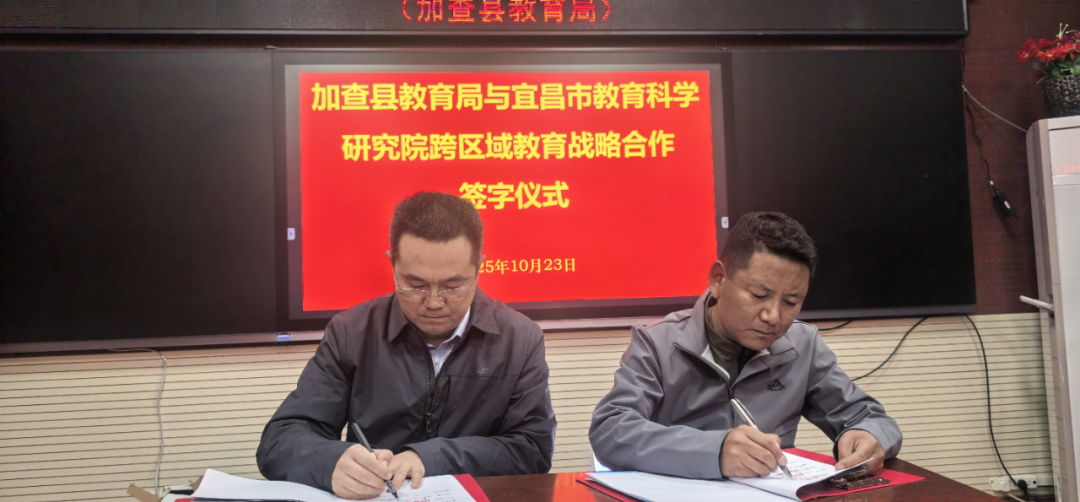 蒋葵林与土登旺久共同签订《宜昌-加查“教学评一体化”教研合作战略协议》,这份协议的签署,正式打破两地教育交流的“短期合作模式”,构建起常态化、深层次的协同发展机制。